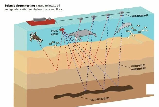 Non-stop ear shattering pulses of 242 decibels every 10 seconds will occur for 90 consecutive days. Not only do seismic surveys burst larvae within the plush mats of phytoplankton, the basis of the entire marine web, but also, they smash to smithereens eardrums of cetaceans (whales, dolphins, porpoises). Excruciating pain drives these masterpieces to beach themselves before eventually expiring.